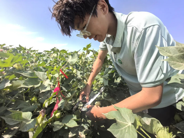 农学院新疆棉花分子身份证构建及应用社会实践团深入第三师四十四团五连棉花田间,开展了一场接地气的农业实践活动,用专业知识助力棉花产业提质增效。烈日下的棉田绿意盎然,实践团成员们脚踩泥土,手持卷尺、游标卡尺等专业工具,对棉花植株进行细致测量:逐一记录植株高度、茎秆粗度,清点叶片数量并测量叶片大小,精准采集各项生长指标。通过系统的数据收集与分析,团队实时掌握棉花当前的生长态势,为评估作物长势提供科学依据。在测量过程中,成员们格外关注棉花植株的健康状况。他们俯身细致观察叶片背面、茎秆分枝等部位,仔细排查是否存在蚜虫、红蜘蛛等病虫害隐患。发现部分棉株出现轻微叶片发黄现象后,团队结合专业知识,现场为赶来的棉农讲解病虫害早期识别方法,并提供了科学的防治建议和田间管理措施。