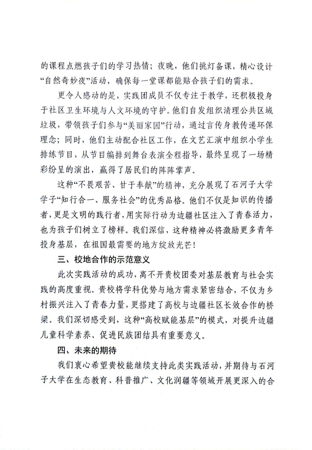 感谢信中,社区特别肯定石河子大学对基层实践的支持。此次活动将高校学科优势与地方需求深度融合,既为乡村振兴注入青春动能,也搭建起校地长效合作桥梁。从自然教育实践到文化活动赋能,农学院师生以实际行动探索“高校+社区”协同育人模式,为边疆儿童科学素养提升、民族团结进步贡献力量。