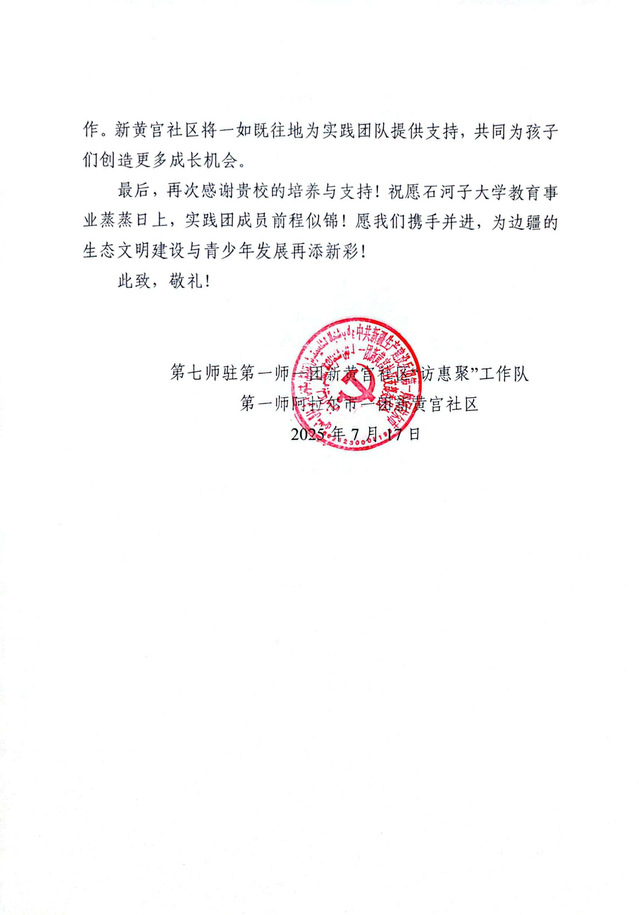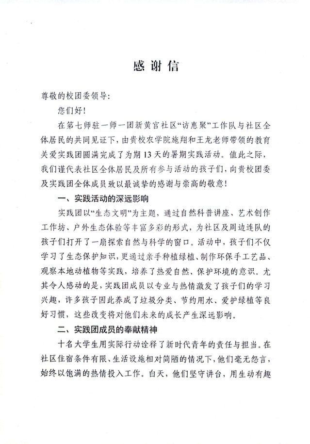 近日,第七师驻第一师一团新黄宫社区“访惠聚”工作队与社区居委会向石河子大学发来感谢信,对农学院施翔、王龙老师带领的教育关爱实践团暑期开展的自然教育实践活动予以高度肯定与诚挚感谢。