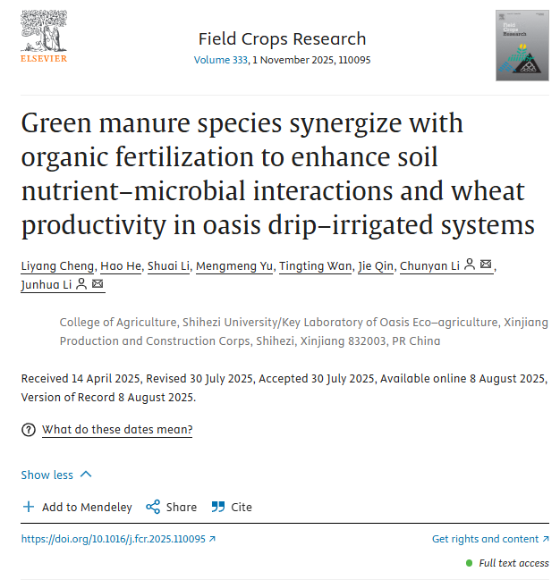 近日,我院李俊华教授在农林科学领域TOP期刊《Field Crops Research》(中科院一区,IF2025=6.4)上发表了题为“Green manure species synergize with organic fertilization to enhance soil nutrient–microbial interactions and wheat productivity in oasis drip–irrigated systems(绿洲滴灌系统中绿肥作物与有机施肥促进了土壤养分-微生物互作,并提高了小麦生产力)”的原创性研究论文。