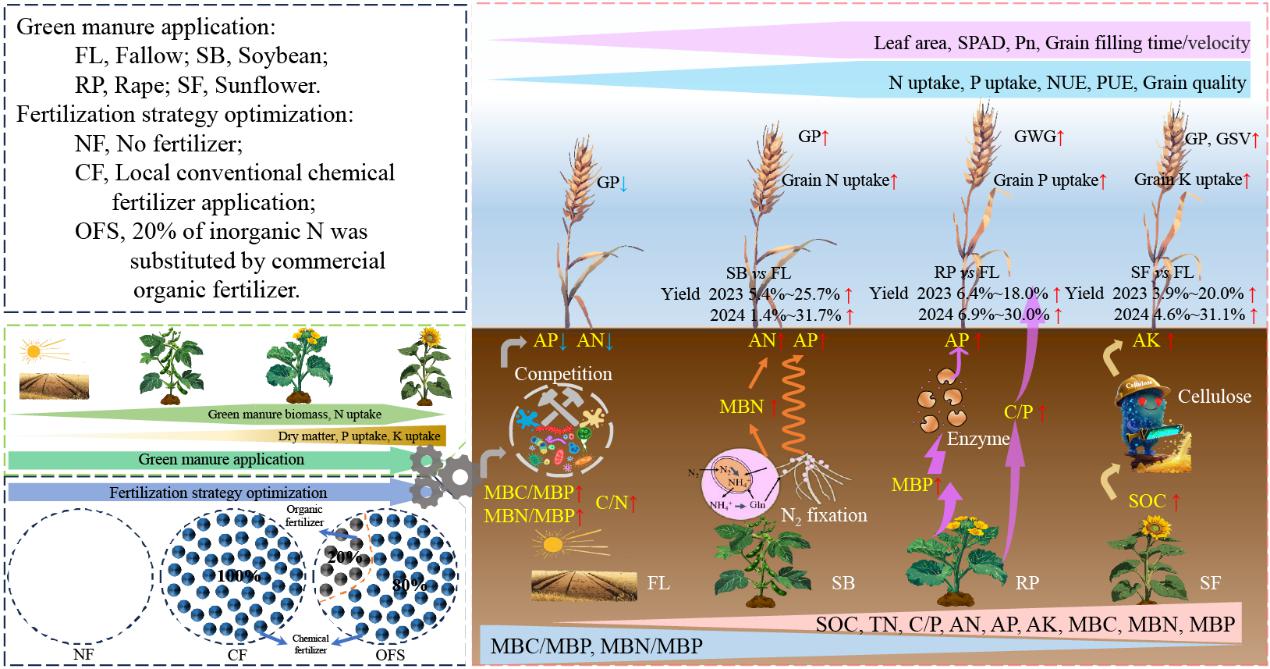该研究通过连续两年(2023–2024)的田间定位试验,系统探究了在有机肥替代部分化肥背景下,不同绿肥作物(大豆、油菜、油葵)与施肥策略对土壤养分化学计量特征、微生物生物量及小麦产量形成的协同调控机制。结果表明,与单施化肥相比,有机替代显著提高了小麦叶片光合速率、灌浆持续期和籽粒养分吸收量,并改善了籽粒品质。在不同绿肥处理中,油菜绿肥在提升土壤有机碳、碳磷比和有效磷含量方面表现突出,并通过促进微生物生物量磷的增加实现最高增产效应。该研究提出了基于绿肥作物选择与施肥策略相结合的技术路径,为干旱区小麦生产实现“增产提质、生态集约”提供了理论依据与技术方案。