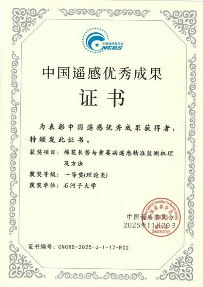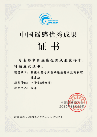 近日,据中国遥感委员会公布结果获悉,由中国科学院空天信息创新研究院、石河子大学、中国科学院地理科学与资源研究所、重庆市规划和自然资源调查监测院共同完成的“棉花长势与黄萎病遥感精准监测机理及方法”成果,凭借在遥感理论创新和关键技术突破方面的突出贡献,荣获2025年度“中国遥感优秀成果”理论类一等奖,石河子大学智慧农业团队张泽教授入选个人获奖名单。