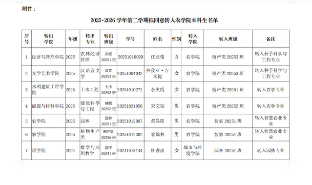 2025-2026学年第二学期拟同意转入农学院本科生名单