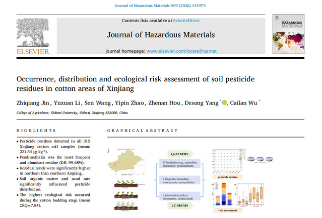 近日,石河子大学农学院杨德松教授、吴彩兰副教授团队在国际权威期刊《Journal of Hazardous Materials》(中科院1区,IF:11.3,TOP期刊)上发表题为“Occurrence, distribution and ecological risk assessment of soil pesticide residues in cotton areas of Xinjiang”的研究论文,系统揭示了新疆棉田土壤中农药残留的时空分布特征及其生态风险。