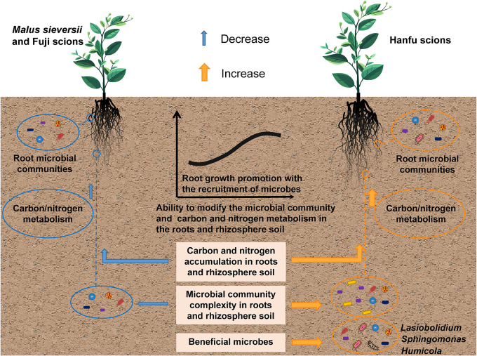 Effect of grafted scion varieties on apple root growth, carbon and nitrogen metabolism and microbiome in roots and rhizosphere soil