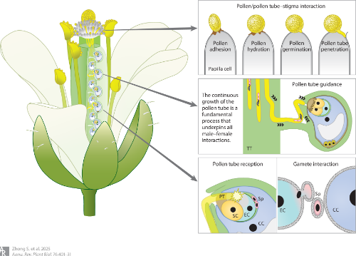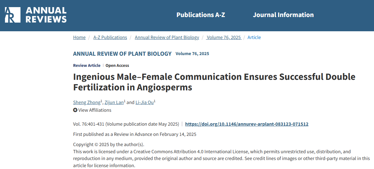 2025年,Annual Review of Plant Biology发表了题为“Ingenious male–female communication ensures successful double fertilization in angiosperms”的长篇综述,梳理并总结了植物生殖生物学领域中关于被子植物雌-雄互作的重要进展。