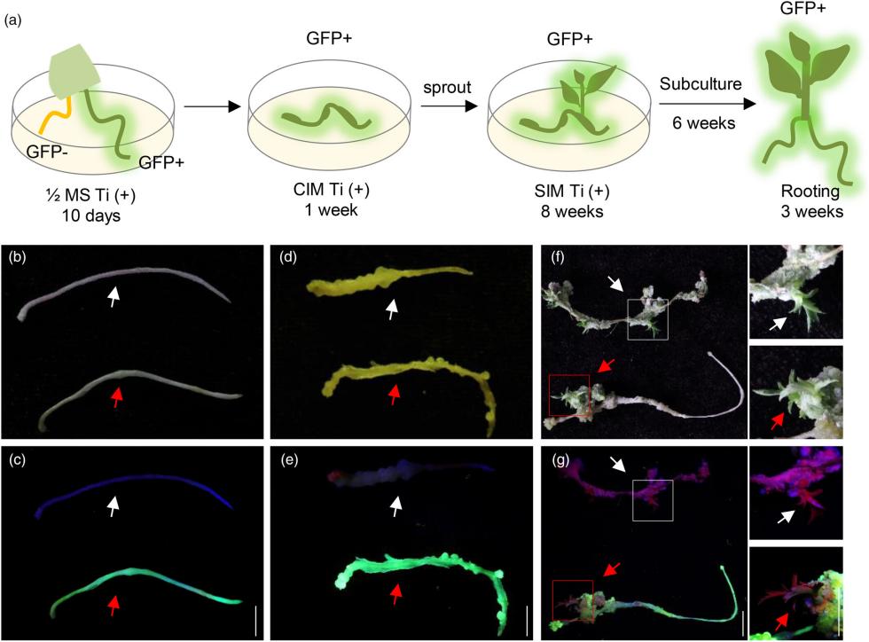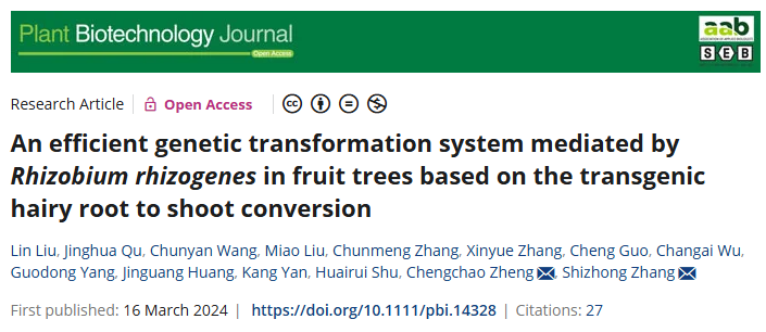 2024年,Plant Biotechnology Journal发表了题为“An efficient genetic transformation system mediated by Rhizobium rhizogenes in fruit trees based on the transgenic hairy root to shoot conversion”的研究论文,开发了果树中发根农杆菌介导的基于转基因毛状根向芽转化的高效遗传转化系统。