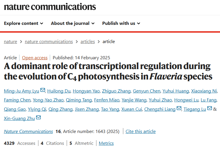2025年,Nature Communications发表了题为“A dominant role of transcriptional regulation during the evolution of C4 photosynthesis in Flaveria species”的研究论文,解析了黄顶菊属中编码C4光合作用途径酶的基因演化过程,揭示了ERF转录因子在C4光合演化中的关键作用。